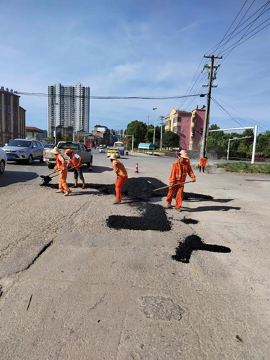 10日上午,在县道X209线14至34公里段,海口管理站的四名养护工人在站长王贵冰的带领下,挥铲铺油修补路面坑槽。