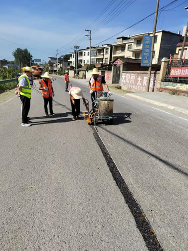 养护中心苗圃场养护人员在道路边上现场熬油给道路划线。
