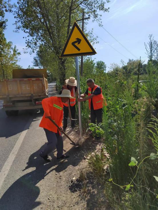 中心安全设施维护组正在安装道路标志标牌。