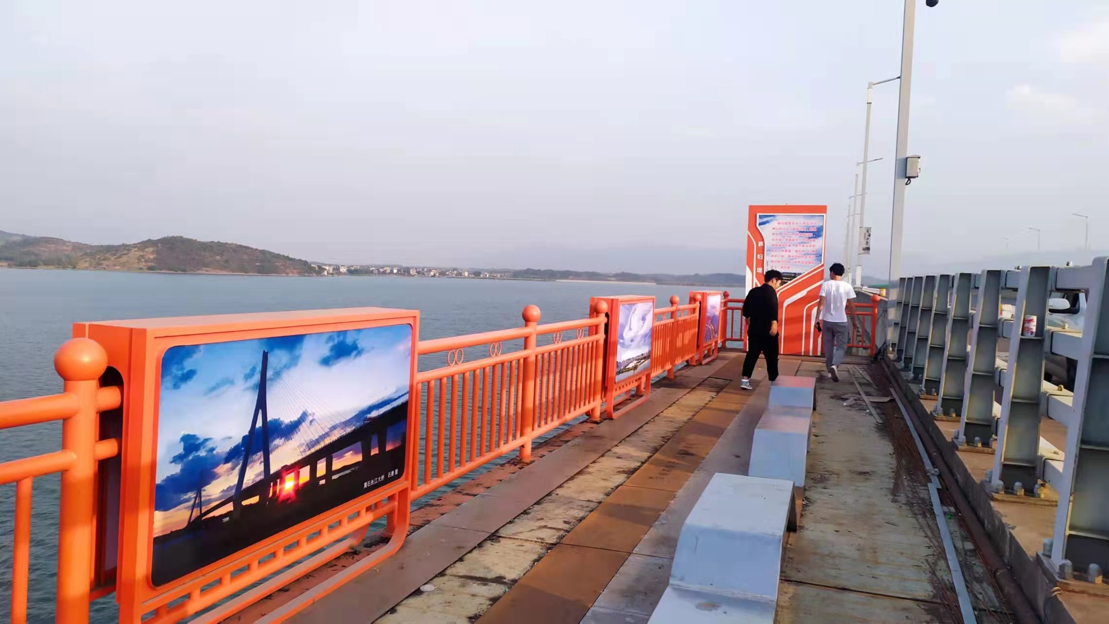 布置一新的黄阳公路大桥上,关于大冶湖四大传说分立于4个亲水平台,反映黄阳公路大桥、大冶湖、黄石山水的20幅本地风景照被制作成展箱,悬挂在大桥4个亲水平台上。刻有“落霞与孤鹜齐飞”“秋水共长天一色”等经典语句的铺线型雕塑正在铺装平台地面,供市民小憩的不锈钢座位已安装到位,可供市民使用。
