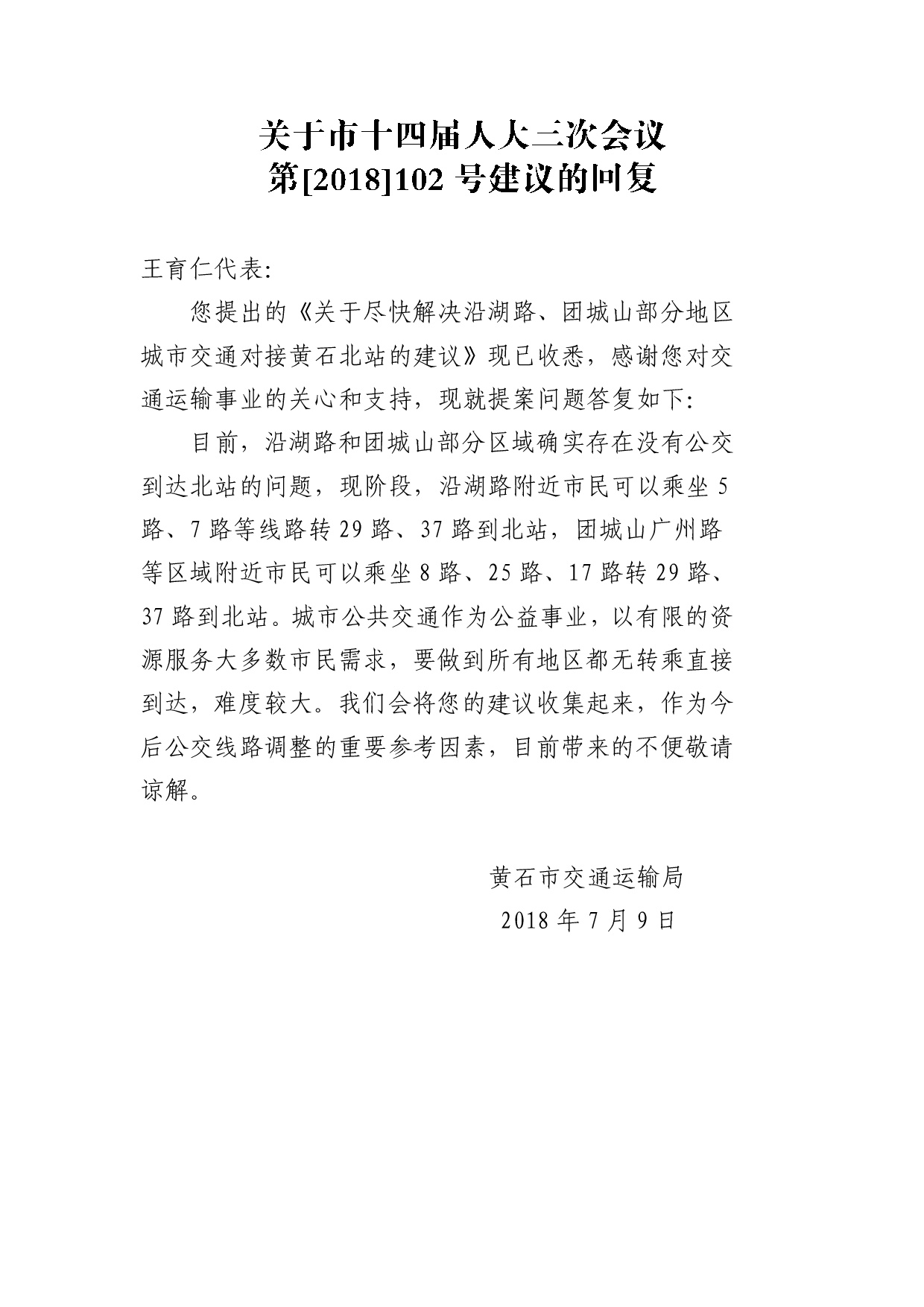 关于市十四届人大三次会议第[2018]102号建议的回复