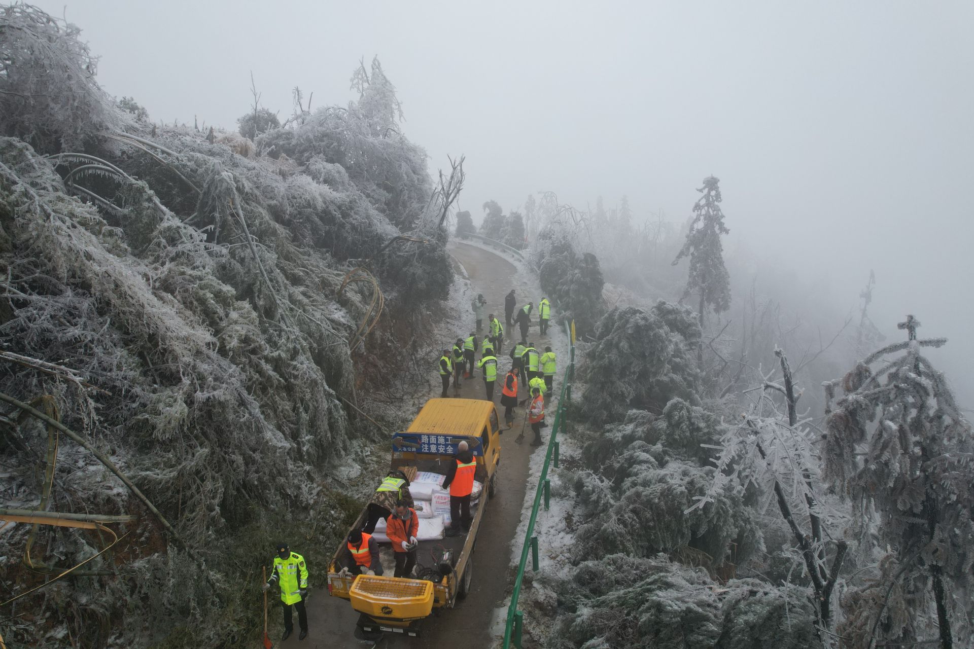 下午2点,大冶市公路局、应急管理局和交通运输综合执法大队等人员车辆到达现场,大家都被现场的“冰雪世界”所震惊,放眼望去,山上树木许多被冻雨压垮,路面结冰,倒伏的树木已将路面遮盖。一部分抢险队员用提前准备的挖土机在前方开路,将倒伏的树木、竹子进行清除,其余队员紧随其后,用铁锹、雪铲、镐对结冰的路面进行清理,并撒布工业盐防止路面再次结冰。