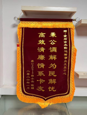 2026年新年首个工作日暖意浓,黄石市水陆运输事业发展中心收到一份特殊的快递:一面印有“秉公调解 为民解忧,高效清廉 情系卡友”的锦旗,其背后是市水陆中心业务骨干通过12328热线高效解决货运司机运费纠纷的暖心故事,这面锦旗不仅是对中心高效调处运费纠纷的诚挚赞许,更是对行管部门牢记使命、倾情服务的莫大鼓舞。