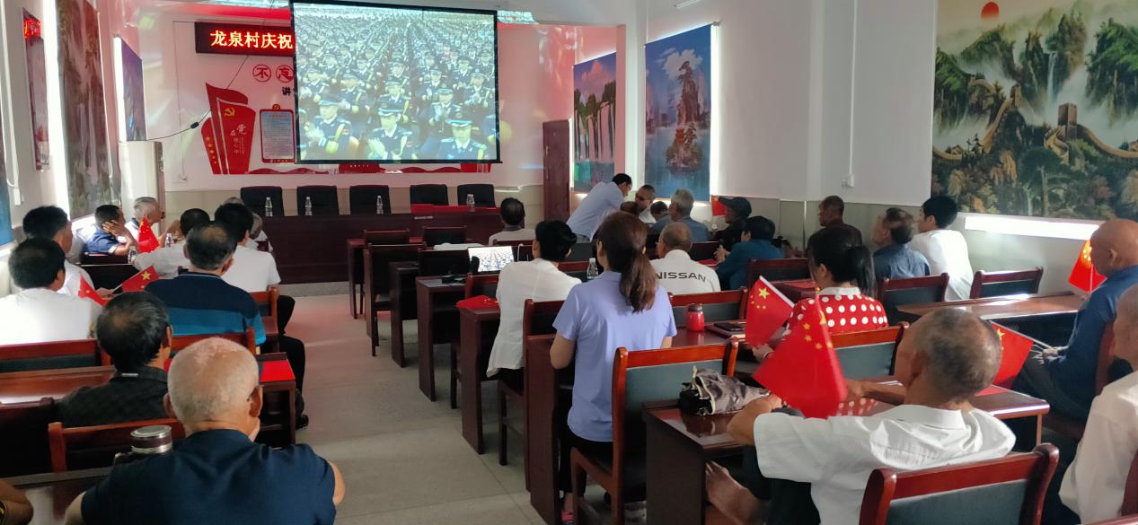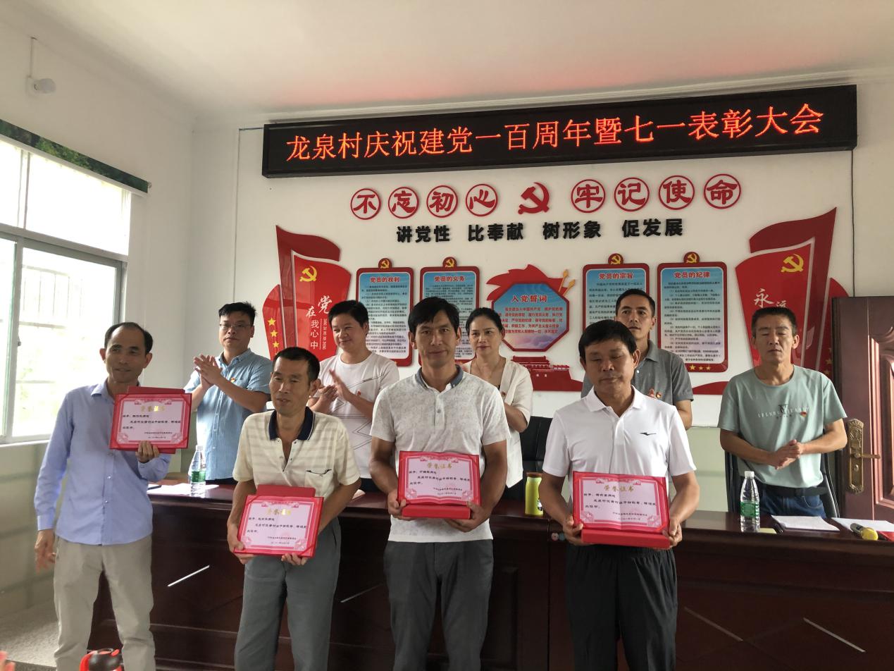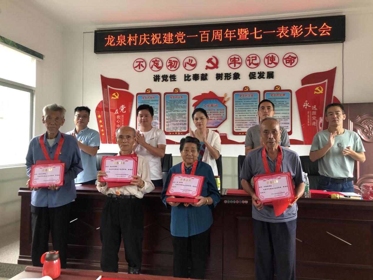 观看庆祝大会结束后,龙泉村庆祝建党一百周年暨七月份支部主题党日活动在庄严的国歌声中拉开序幕。李红卫和镇领导、村干部一起为4名老党员颁发了“光荣在党50年”纪念章,为3名优秀共产党员、4名优秀村组干部颁发了荣誉证书。